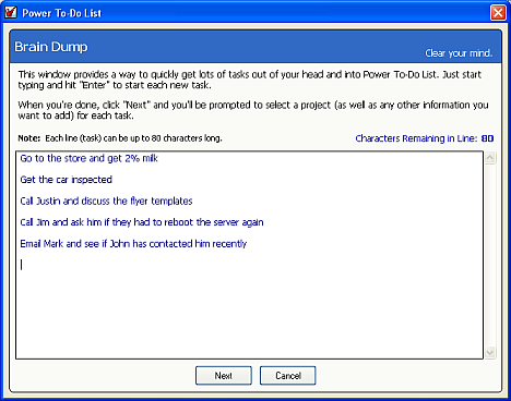 The Brain Dump feature in Power To-Do List provides a quick way to enter several tasks into the program. Just start typing tasks, hitting ENTER between each one.