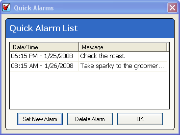Set New Alarm: Pops up a dialog where you can enter a new alarm