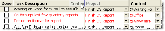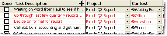Each view (left-side buttons) shows a task list with a slightly different set of columns. Each view also remembers any changes you make to its columns.