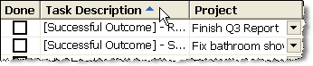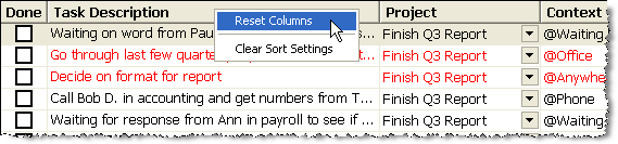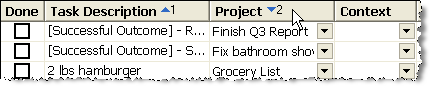 In all the views except "Project View" and "Next Actions View", you can sort by just about any column. In fact, you can sort by up to three columns.
