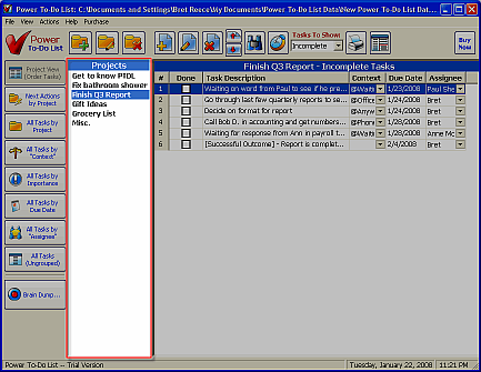 Each task in Power To-Do List has a project. You can have as many projects as you want. Normally, when you're working with your projects, you'll be in "Project View" (the top button on the left side toolbar.)